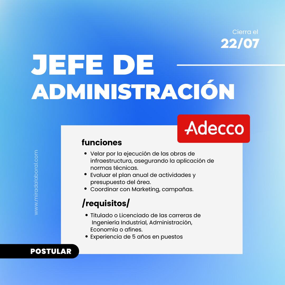 Posted on 17 de julio de 2023 otic Facultad No Comments ADECCO – JEFE DE ADMINISTRACION #USEG | Bolsa de trabajo UNAC ¡¡APROVECHA ESTA OPORTUNIDAD!! La empresa ADECCO se encuentra en la búsqueda de: JEFE DE ADMINISTRACION CARRERA: Ingeniería Industrial, Administración, Economía o afines.Interesados postular a través del siguiente link: http://bit.ly/3CJlbzeEncuentra más oportunidades en nuestros portales de empleo:https://jobboard.universia.net/empleounachttp://unac.miradalaboral.com