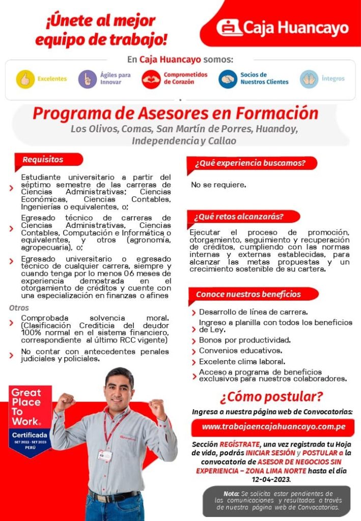 La empresa CAJA HUANCAYO publicó su Convocatoria del PROGRAMA ASESORES DE NEGOCIOS, dirigido a estudiantes y egresados de las siguientes carreras: