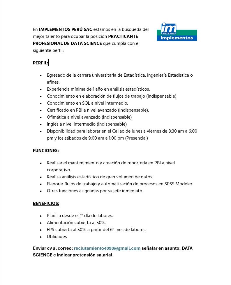 IMPLEMENTOS PERU SAC – ASISTENTE DE COMPRAS NACIONALES – PRACTICANTE PROFESIONAL DE DATA SCIENCE