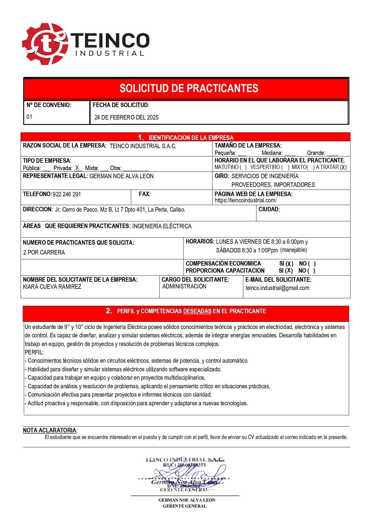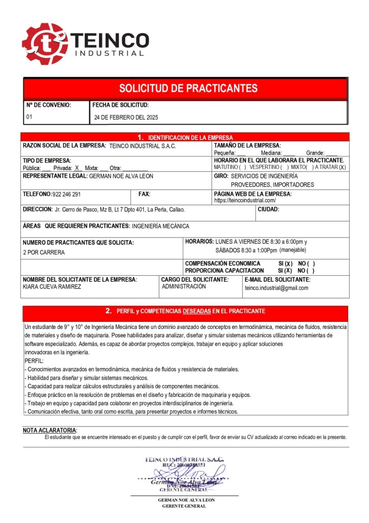 Posted on 25 de febrero de 2025 otic Facultad No Comments TEINCO INDUSTRIAL – Practicas pre profesionales #USEG | Empleabilidad UNAC ¡¡APROVECHA ESTA OPORTUNIDAD!! TEINCO INDUSTRIAL, se encuentra en la búsqueda de: PRACTICANTES PRE PROFESIONALES CARRERAS: Estudiantes de los últimos ciclos de Ing. Eléctrica e Ing. Mecánica. Si le interesa la vacante o conoces a alguien que pueda interesarle, puede postular enviando su CV al correo: [email protected] Encuentra más oportunidades en nuestros portales de empleo:https://jobboard.universia.net/empleounachttp://unac.miradalaboral.com