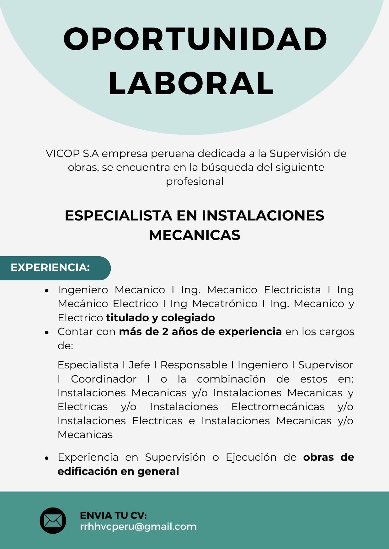 🗂 Si le interesa la vacante o conoces a alguien que pueda interesarle, puede postular enviando su CV al correo: [email protected]
